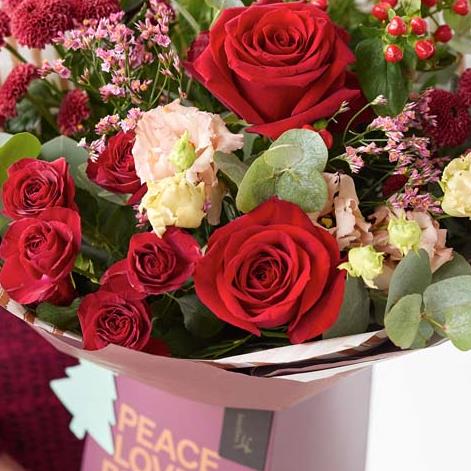 A fabulous festive gift box handcrafted by their local florist, featuring blooms in rich red and green shades, with peach and cream highlights and pops of burgundy and cerise.