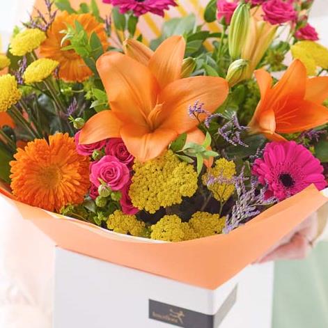A vibrant bouquet of gorgeous fresh and bright flowers, expertly arranged by a skilled local florist. It could feature hot pink flowers, or blooms in shades of fiery orange or rich yellow. It all depends on what’s fresh and the occasion – every bouquet is beautifully unique.