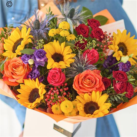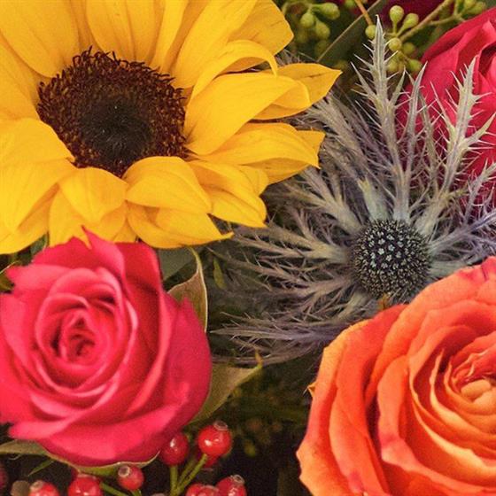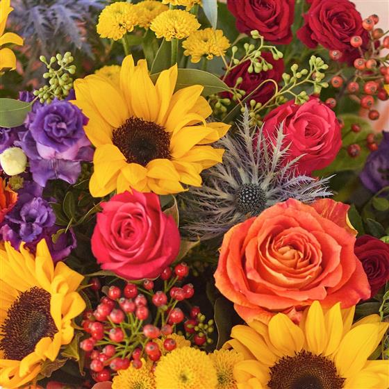Our grandest autumn bouquet this one is a riot of colour and joy. It's all about celebrating the rich jewel tones we find this time of year, plus capturing the last of the sunshine. It'll feature flowers in vivid shades like ruby, amber, mustard and plum, plus at least five joyous sunflowers.