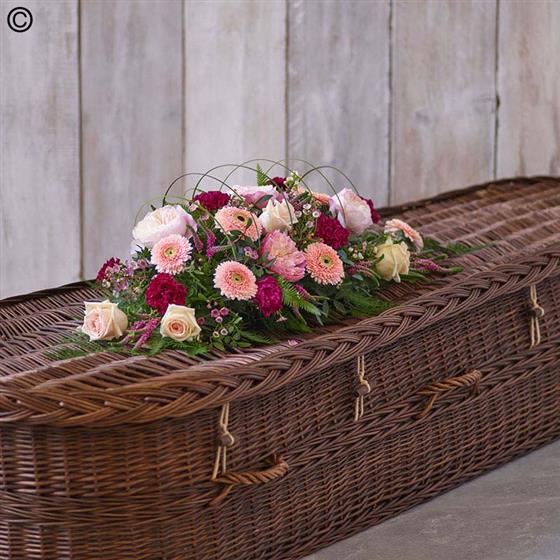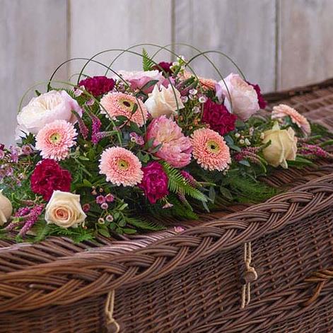 A beautiful spray of pastel blooms, including germini, roses, and carnations, arranged in a linear design.