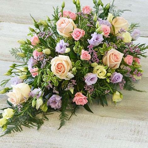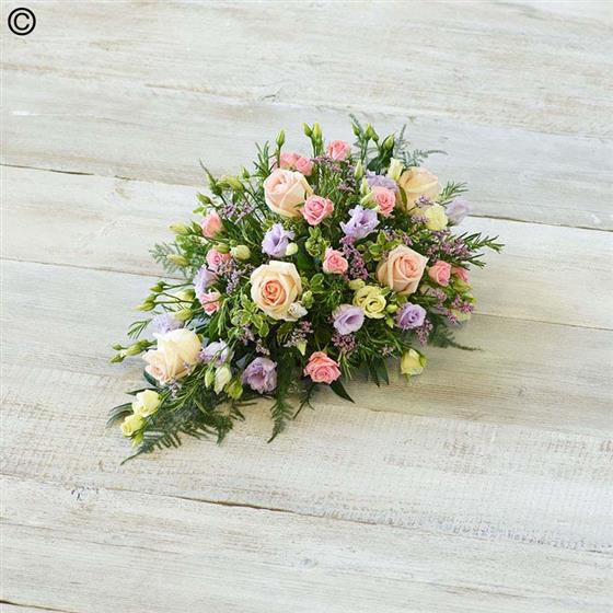 A delicate mix of blooms including roses, lisianthus and scented silvery rosemary. Arranged in a teardrop shape suitable for smaller coffins.