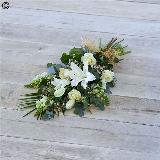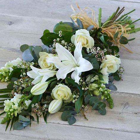 An elegant combination of fresh white tones and rich greens, featuring large ivory roses, oriental lilies, and silvery eucalyptus.