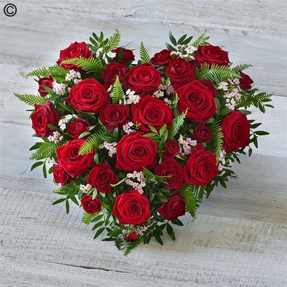 A vibrant heart tribute featuring gorgeous roses, spray roses and foliage.