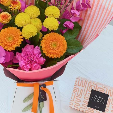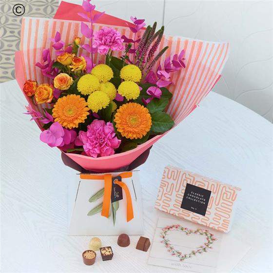 An elegant gift box filled with lush, richly coloured flowers. Expect hot pink, fiery orange and yellow with pops of blue plus dried flowers or foliage for texture. A bit like a vibrant summer sunset. And in case that wasn't enough they'll also get a With Love full sized greetings card, and a box of scrummy gourmet chocolates.