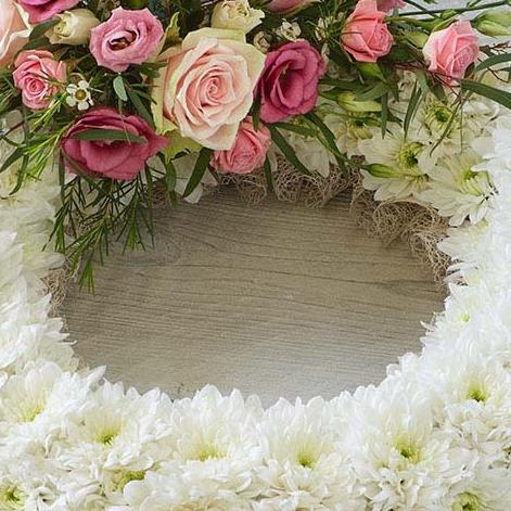A traditional wreath of white chrysanthemums contrasted with a cluster of pretty roses, lisianthus and delicate foliage.